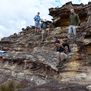 After recrossing the creek, without getting our feet wet I might add, we climbed back up under the Eastern Cliff line and headed North. Try as we might we found no further art, although we did discover a source of Ochre. Around 1 o'clock we stopped in a shallow cave perched high up for lunch. There was a nice view up the valley. During lunch a mysterious cairn of rocks appeared complete with an arrow pointing in the direction we were to follow. Suspiciously Nicole was sitting near there during lunch.